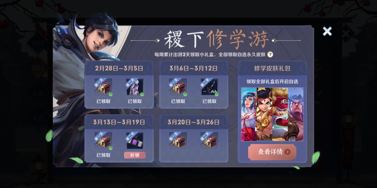 3、 累计四周,领取全部修学奖励后,可以开启修学皮肤礼包,自选4款永久皮肤之一。